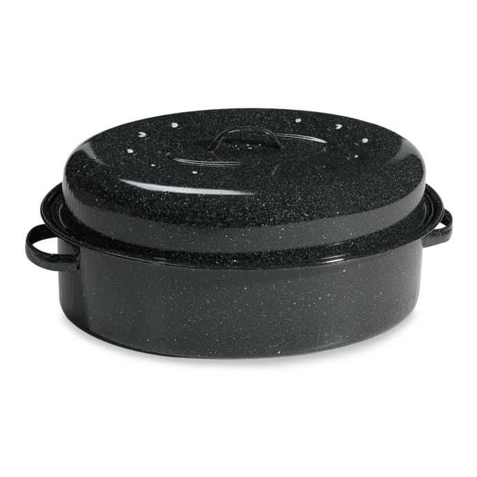 Granite ware roaster is made in usa 19 in covered oval roaster holds up to 20 lb poultry or roast porcelain enamel surface is an inert non porous and naturally non stick surface our roasters have no pfoa ptfe or other harmful chemicals and are dishwasher safe dimension with lid on is.
